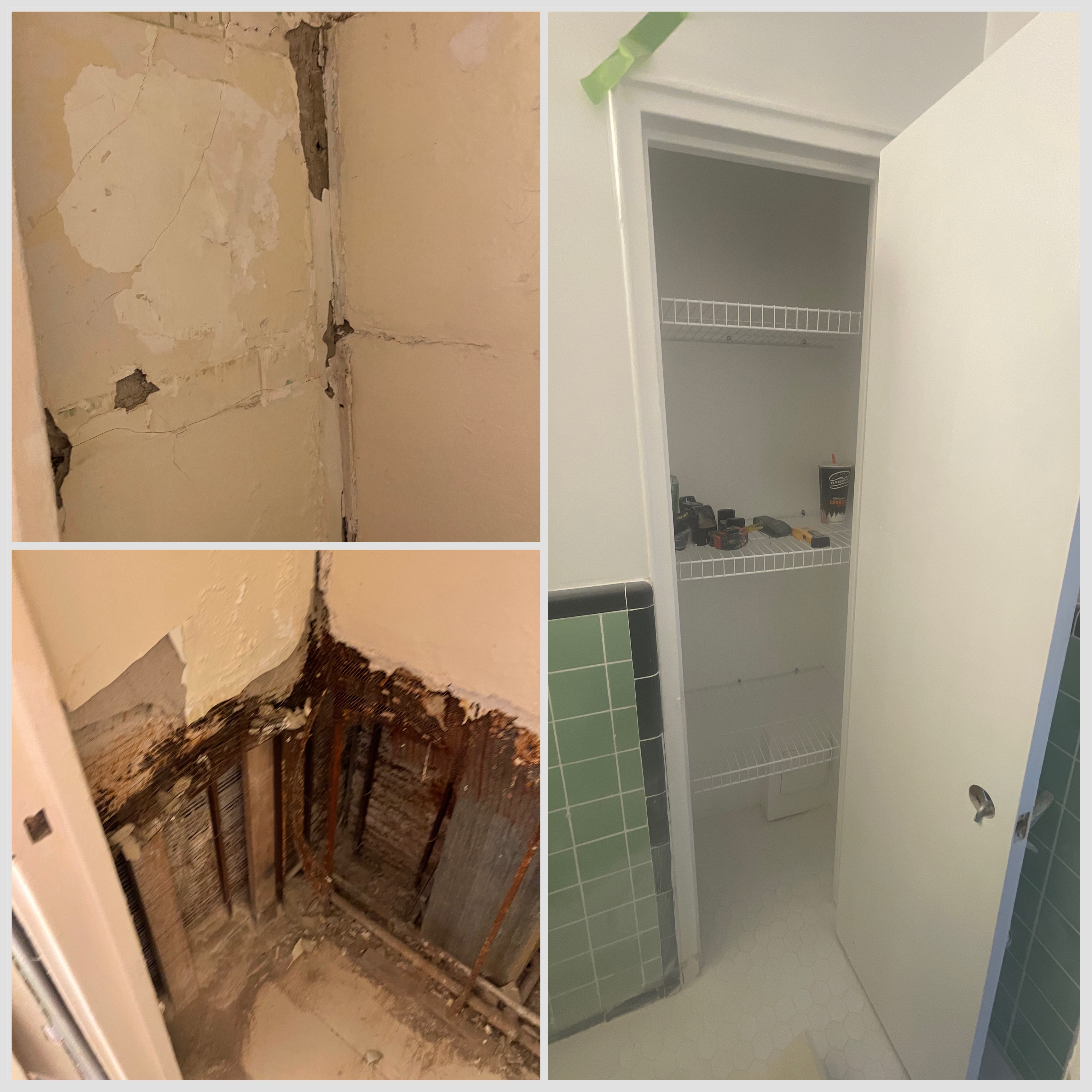 The bathroom closet also received a total overhaul with new framing, drywall, wire shelving and a plumbing access door.