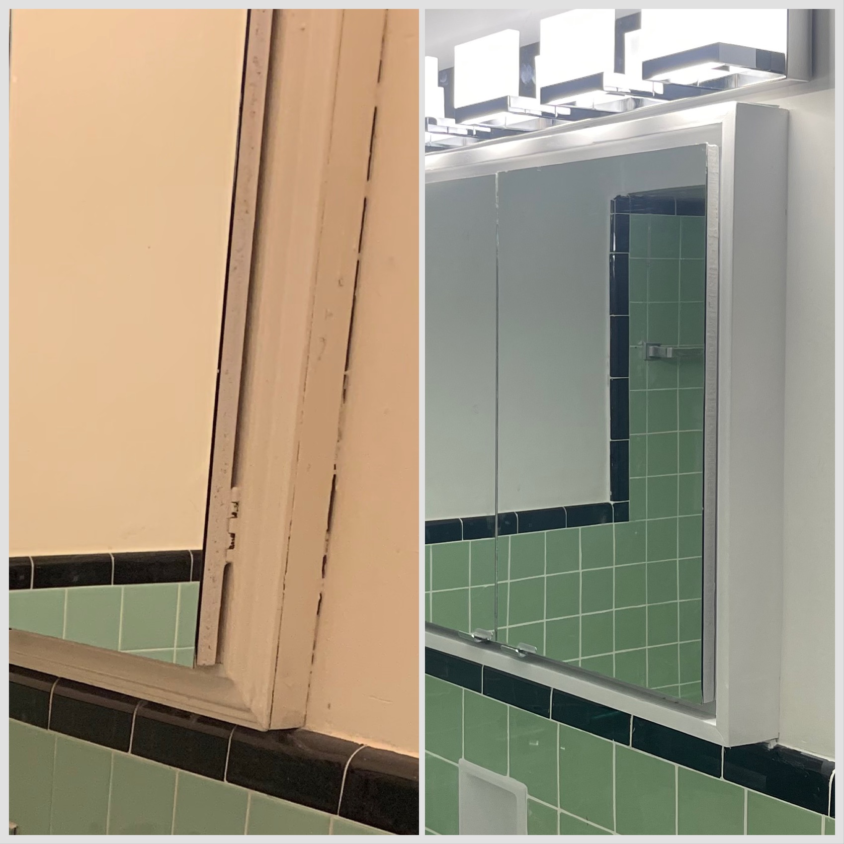 The existing medicine cabinet was also modernized with a custom shadow box frame, hidden soft close euro hinges, and new pulls.