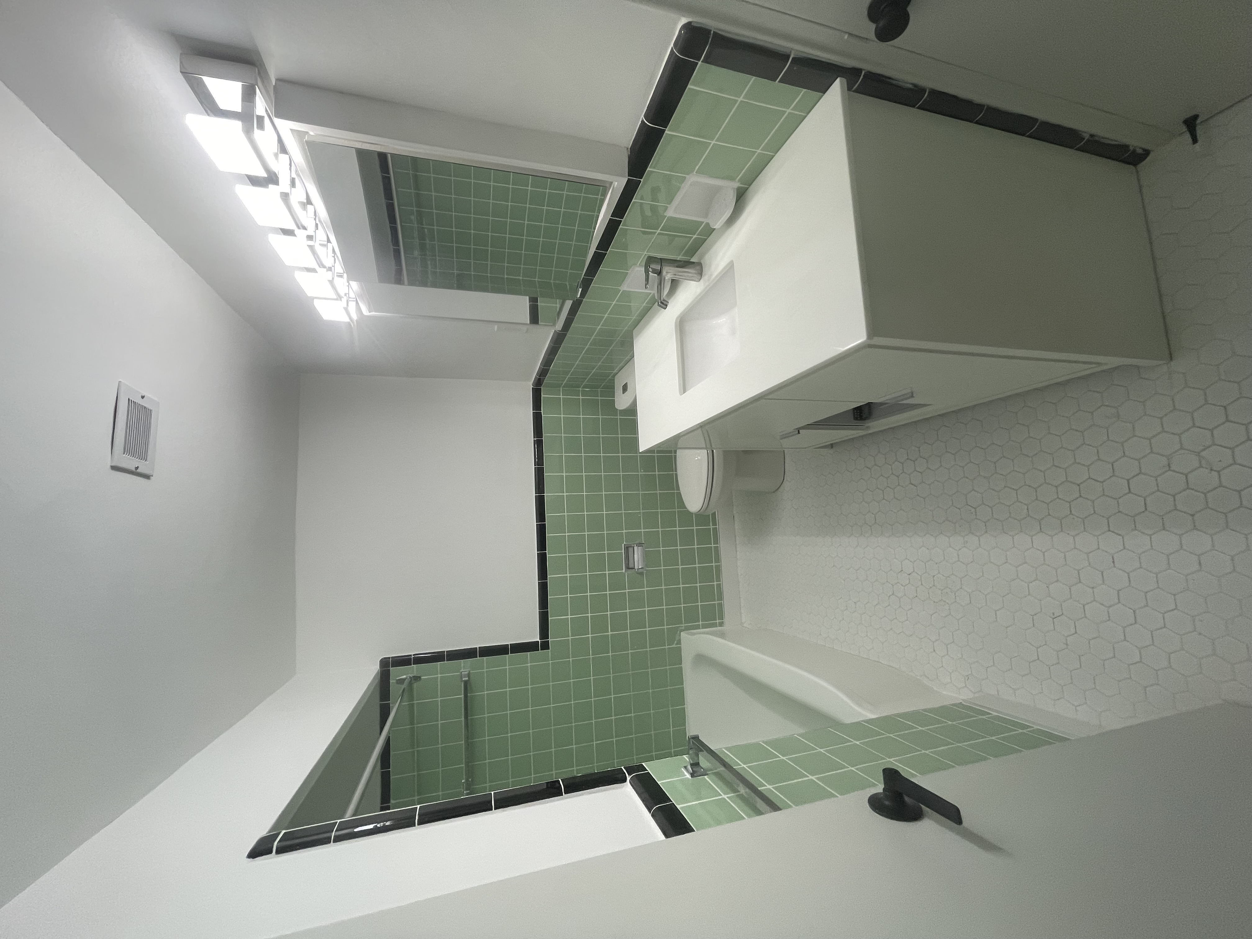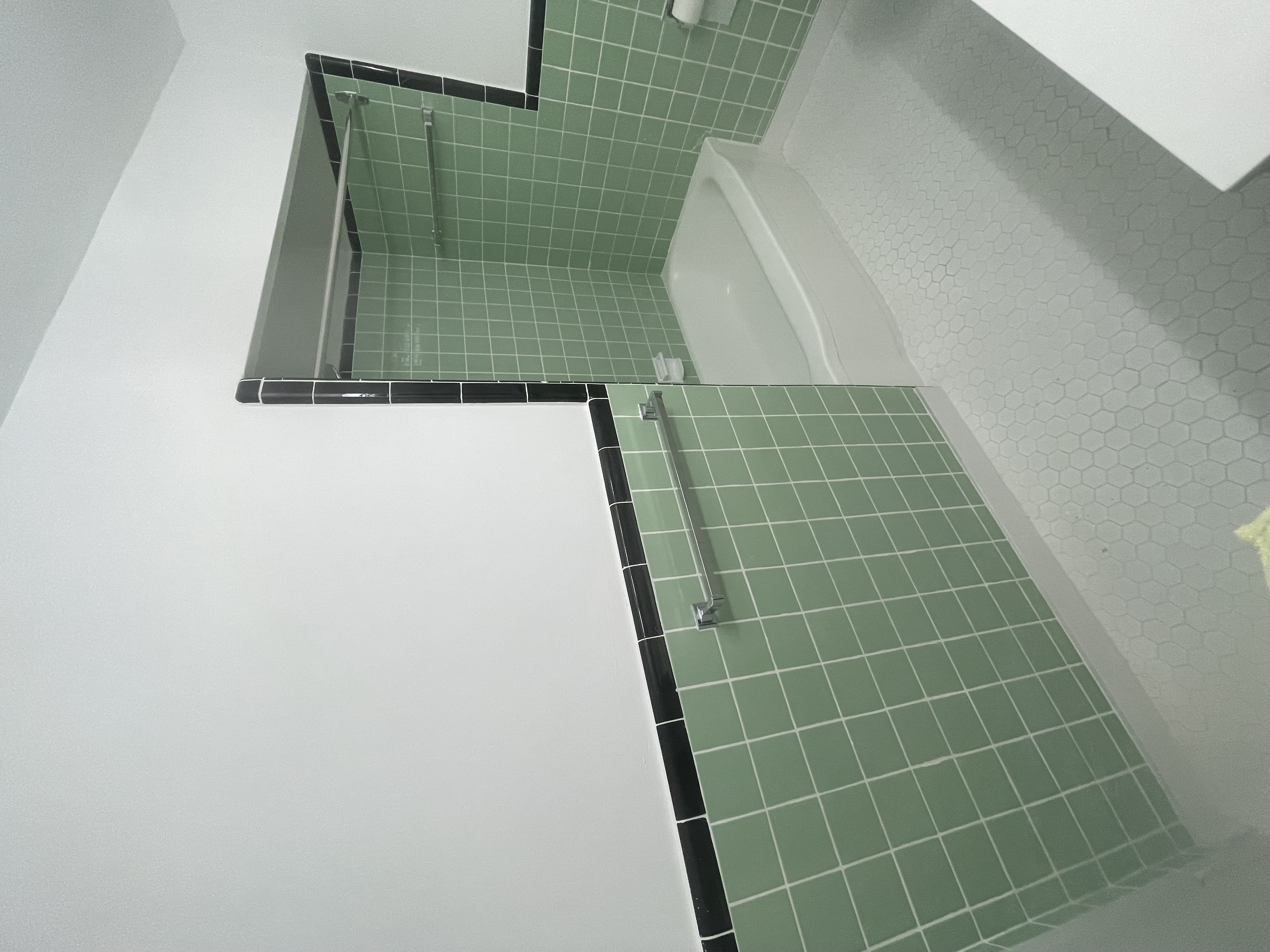 This bathroom refresh was part of a larger apartment remodel, and decisions had to be made about where to allocate the budget for the best overall result. In this regard, removal of the original 1960's green tile, would have materially altered the scope and cost of the bathroom update to the detriment of other projects and so it was decided to leave the tile in place.