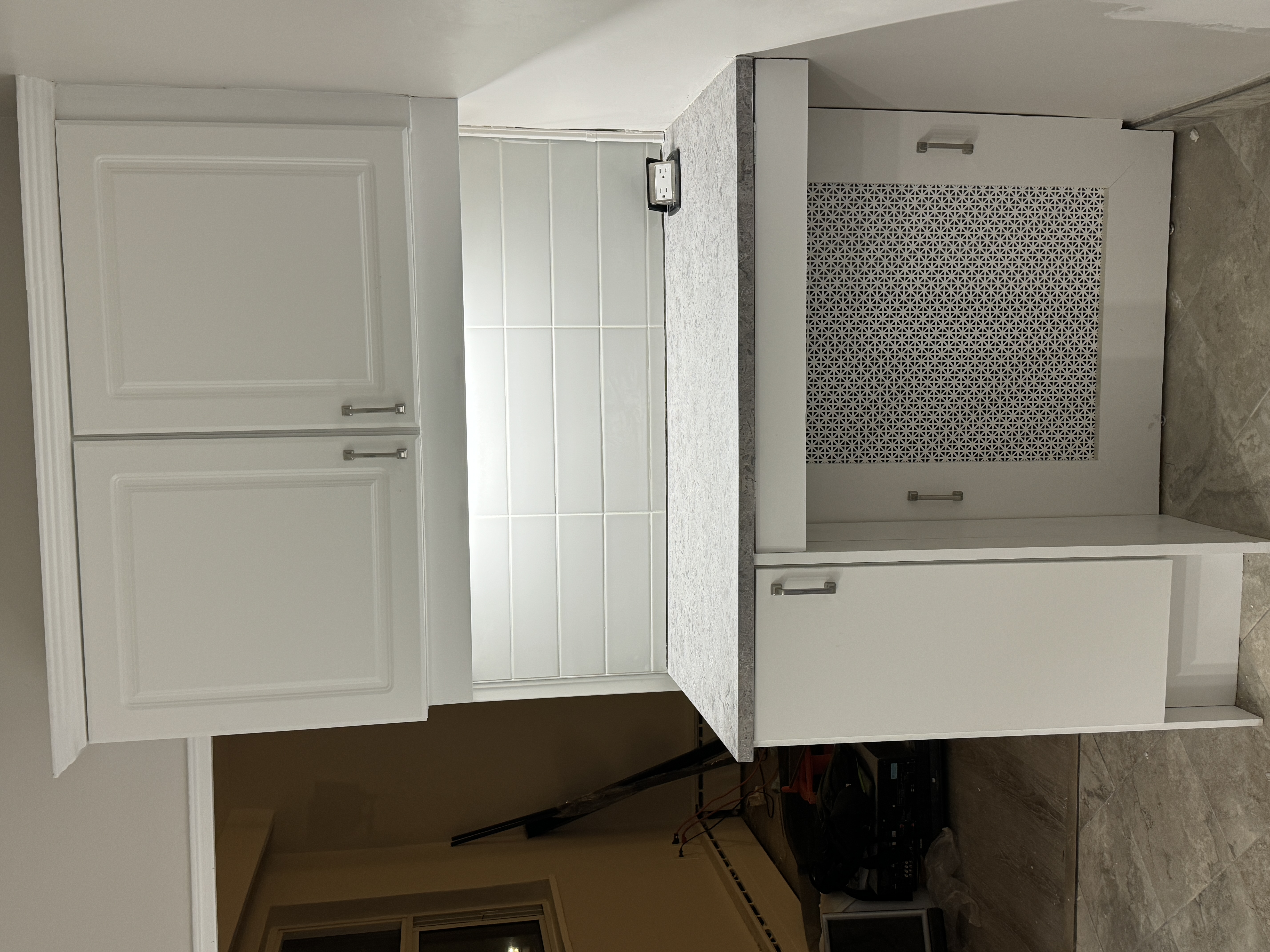 The cabinets were reconfigured to create a functional multipurpose work space with the addition of a simple base cabinet, countertop with pop-up power outlet and custom radiator cover.