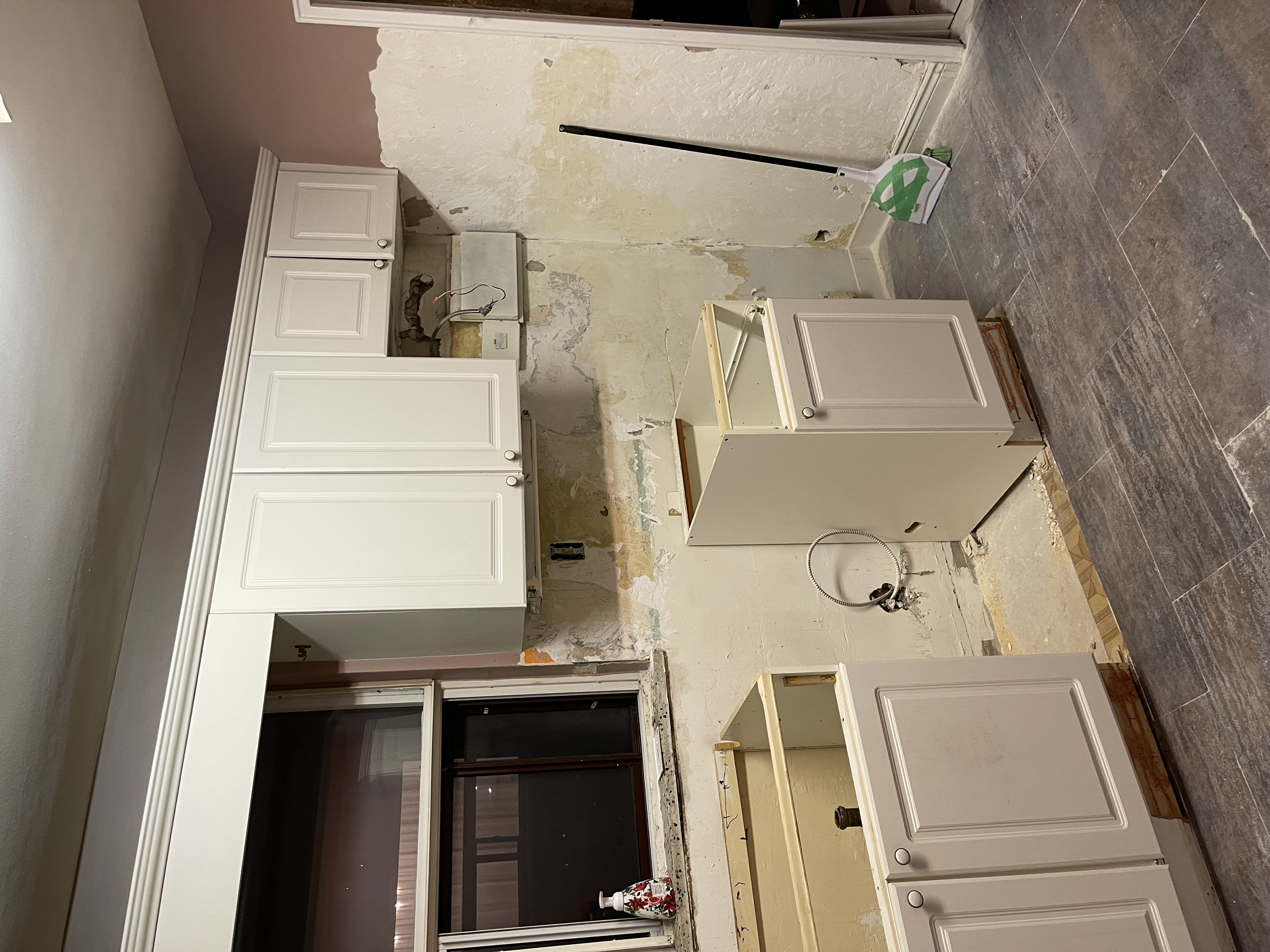Floating upper cabinets that wrapped one corner of the room and a floating shelf below for a counter were awkward and not functional.