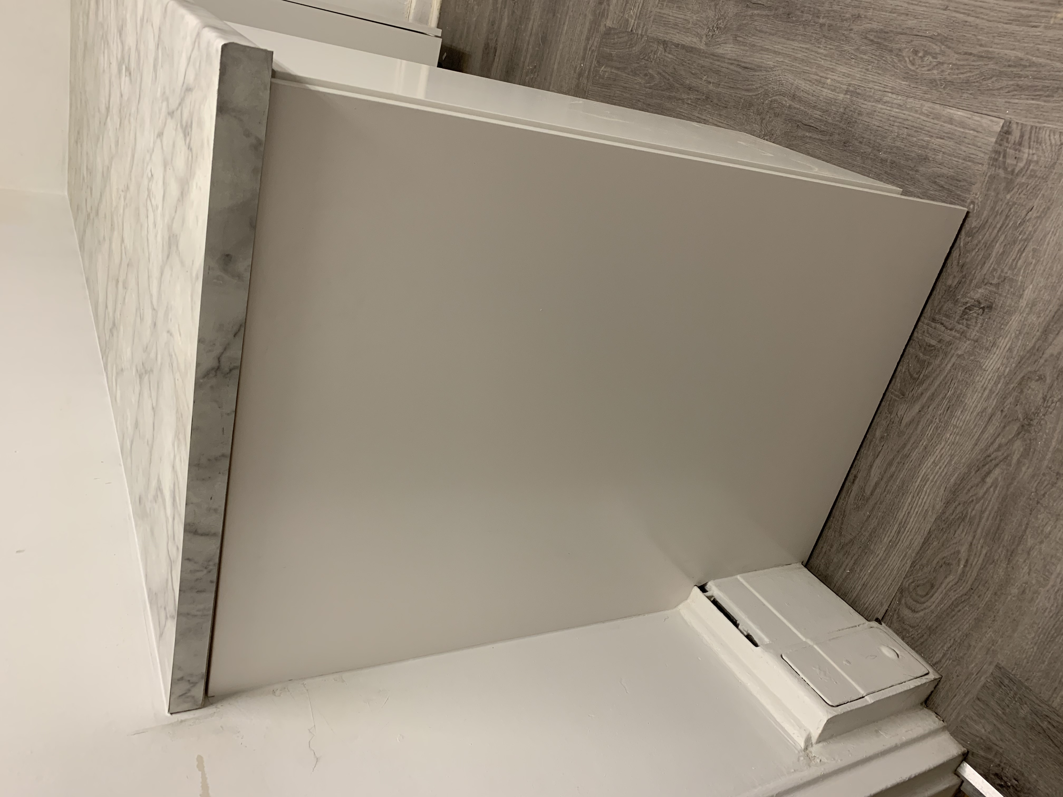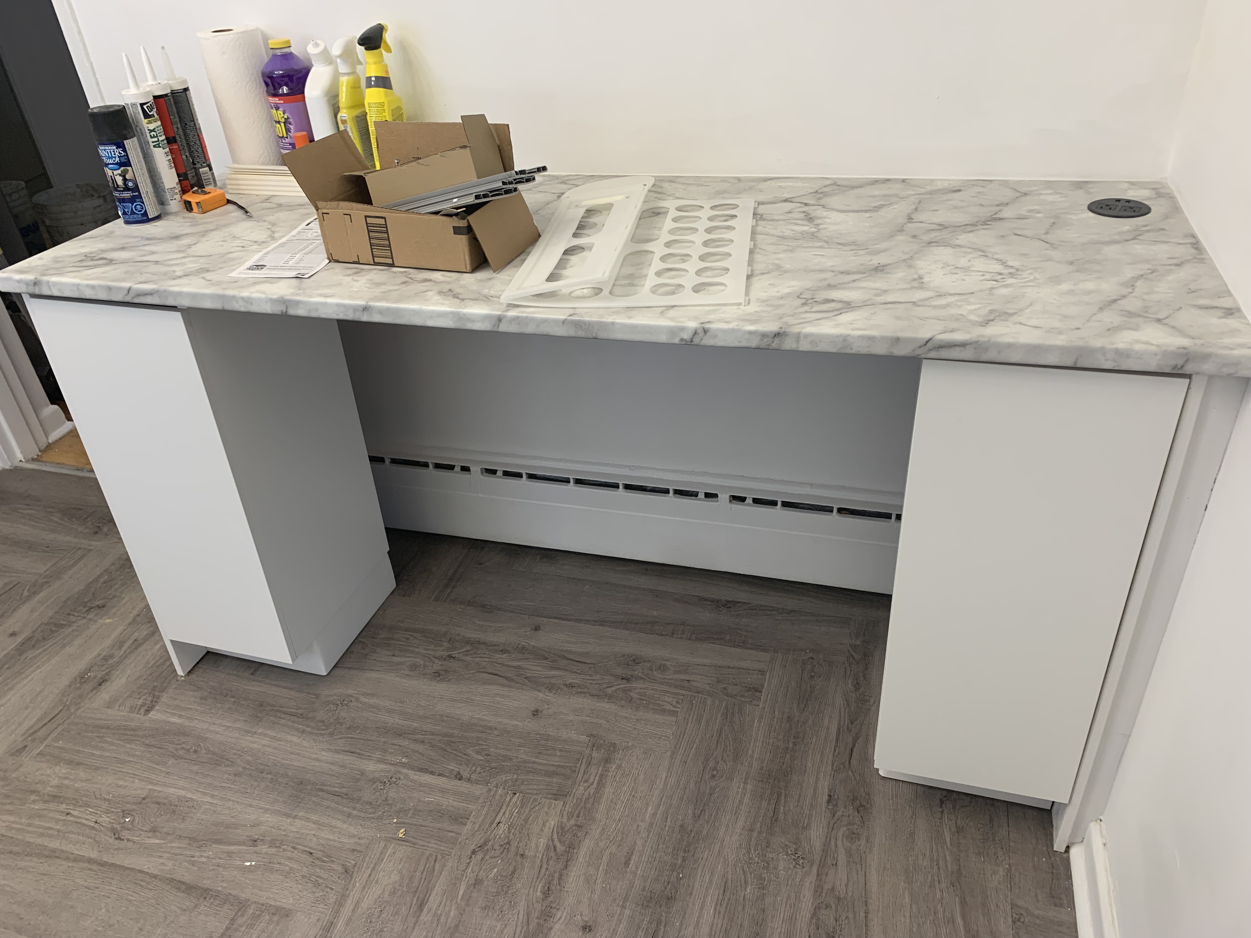 A side panel running the full depth creates the illusion that the cabinets are also full depth. The cabinet obstructed access to the only outlet on that side of the room, so the countertop was fitted with a pop-up outlet.