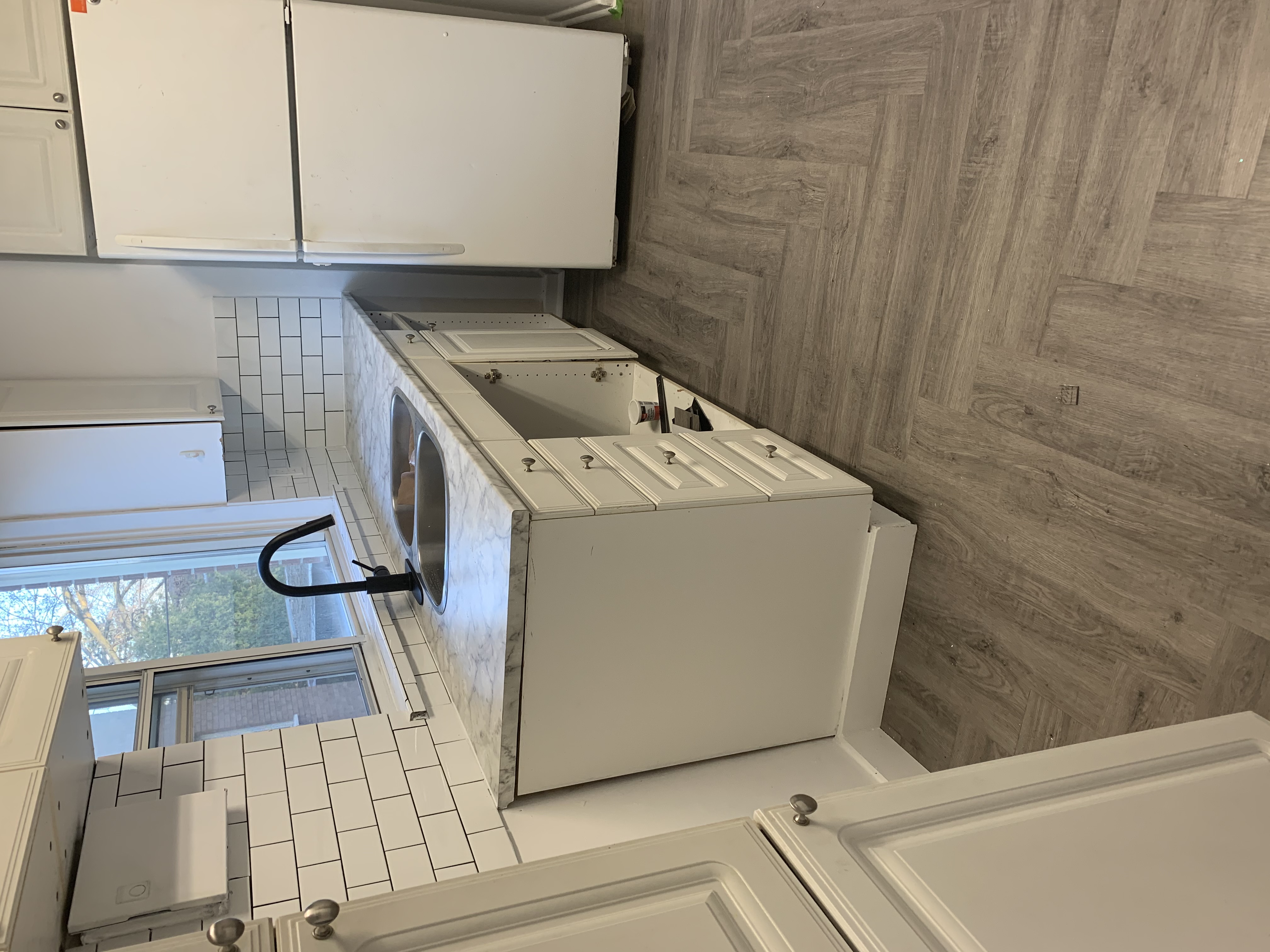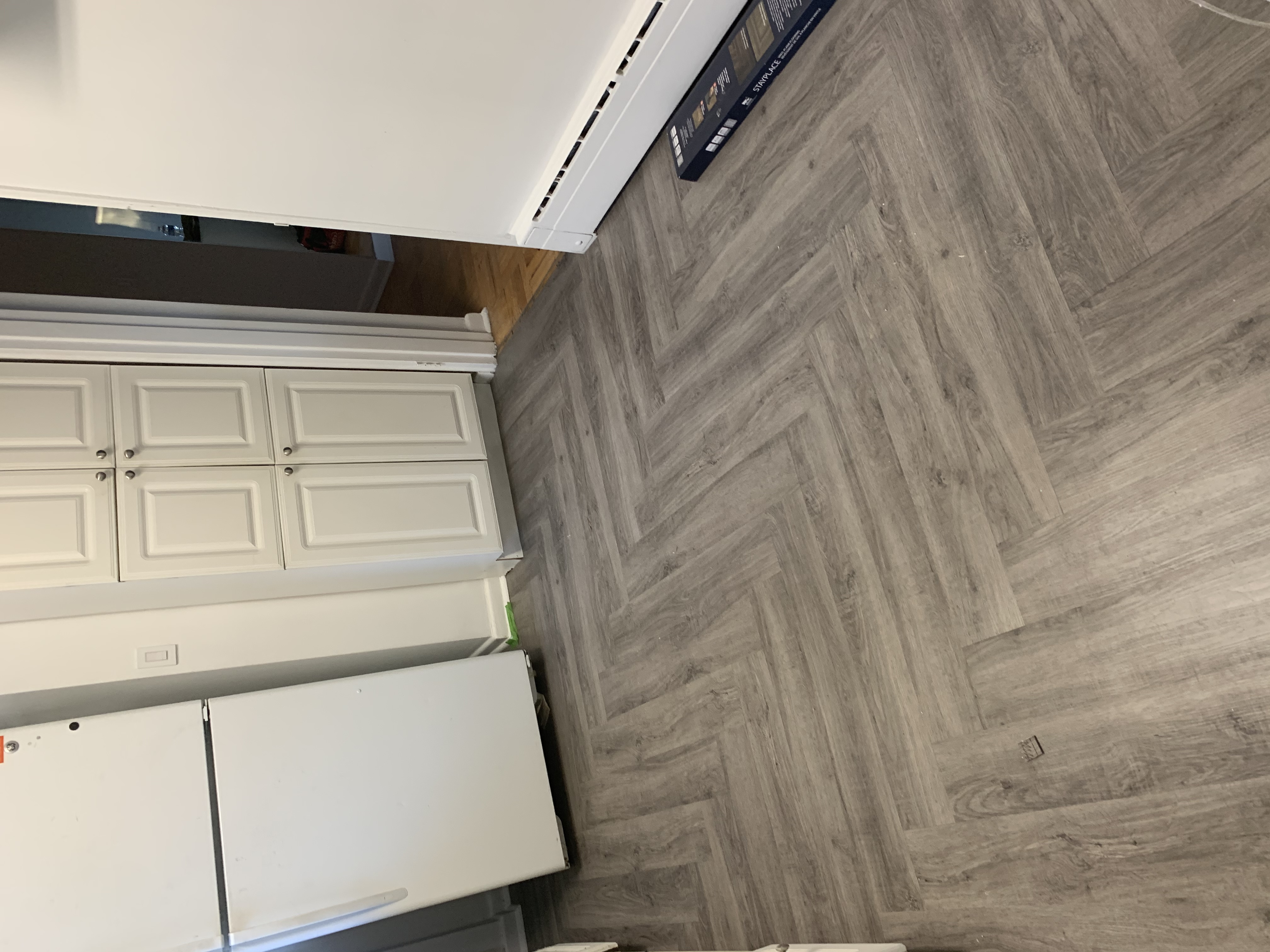 The faded and unsightly vinyl floor tiles were replaced with an inexpensive vinyl plank laid in a herringbone pattern to elevate the look.