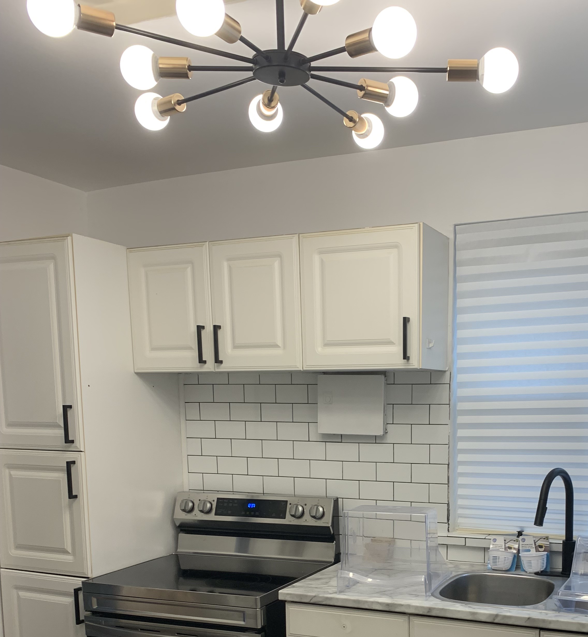 A Sputnik light fixture adds some visual interest to the space and reflects this young family’s personality.