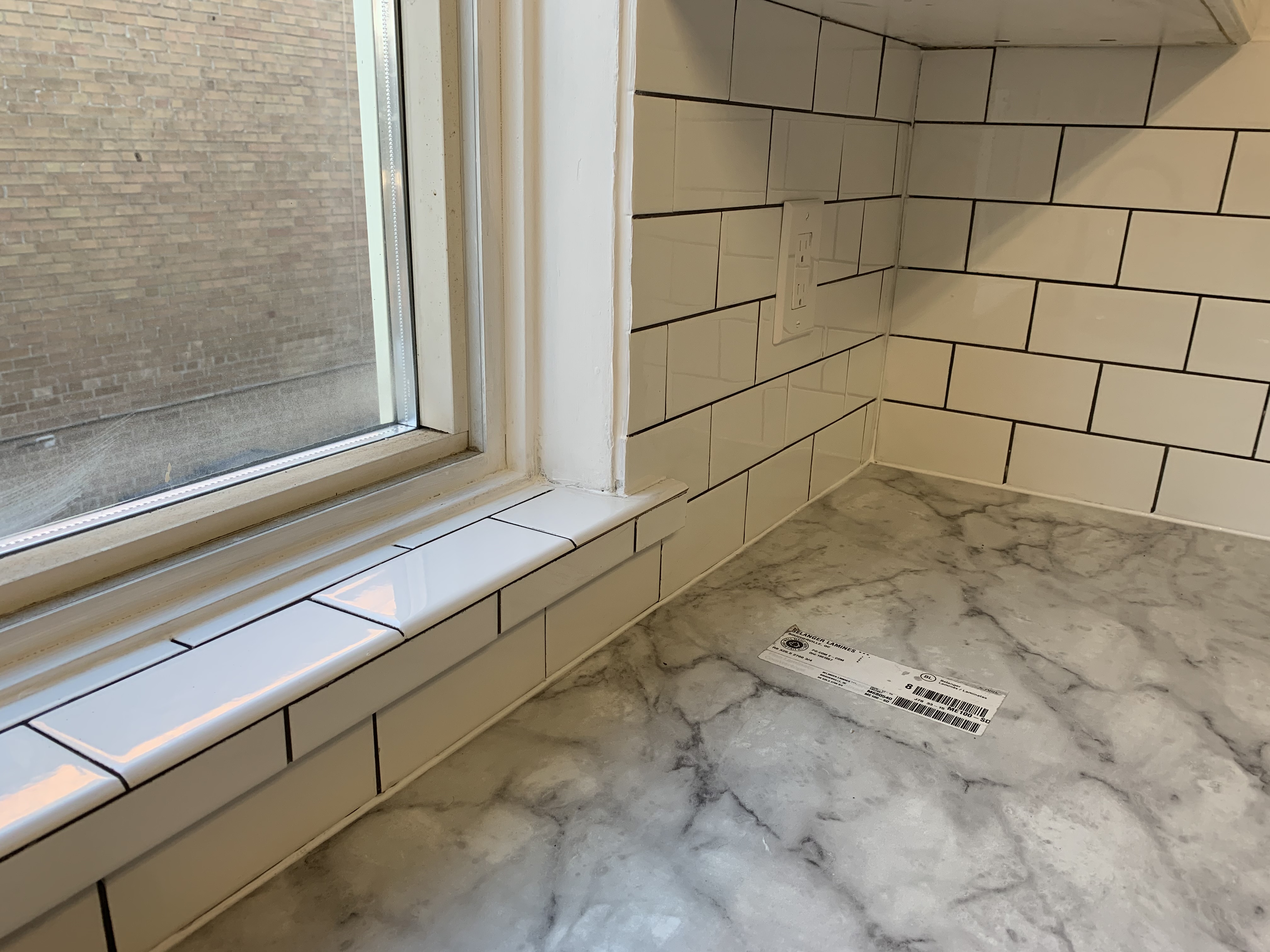 In addition to a new laminate countertop and matte black kitchen faucet, matte black pulls were added to the existing cabinets to update their look. Inexpensive white subway tiles with high contrasting grout adds visual interest to the backsplash and sophistication to the space.