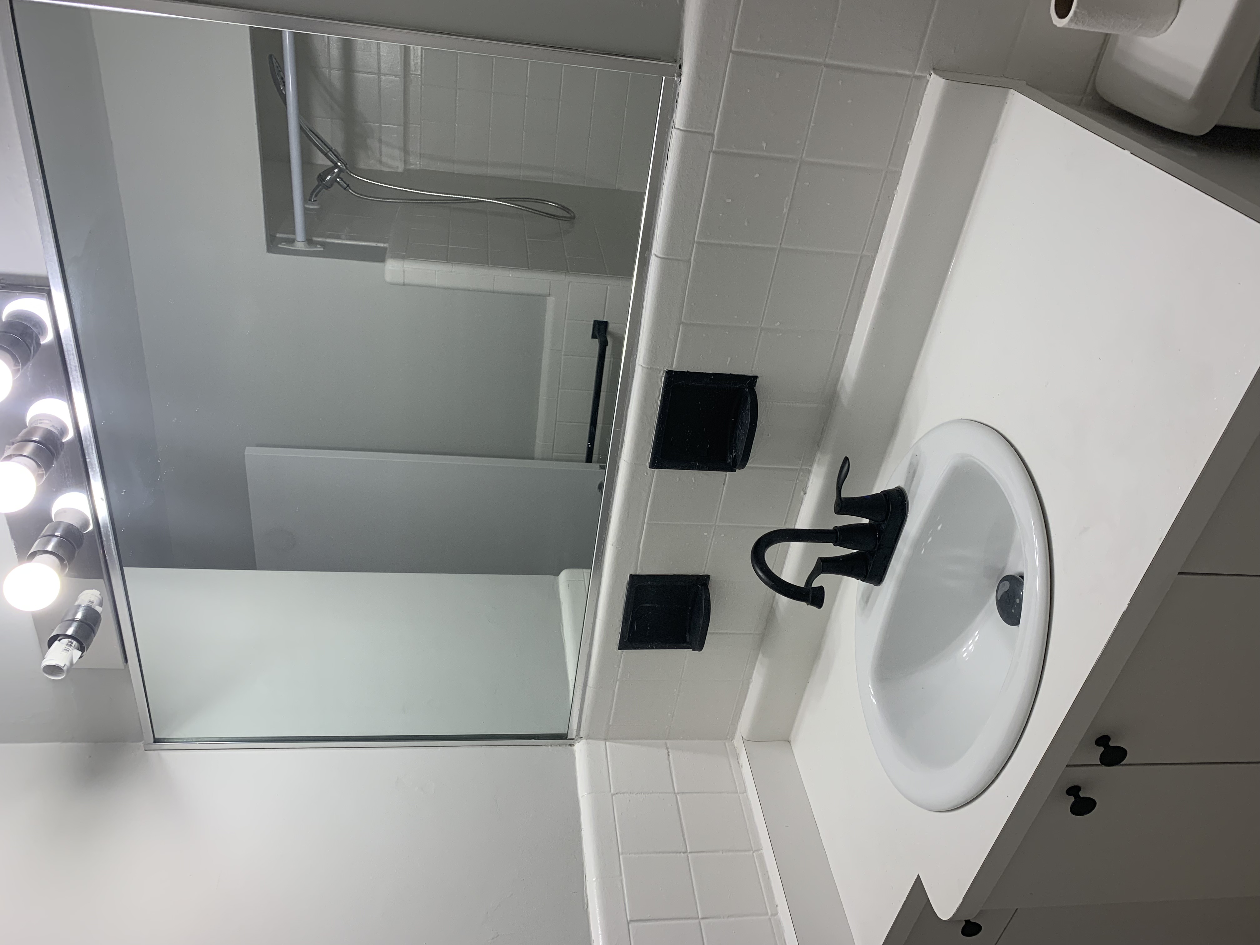 The vanity drawer and door fronts were refurbished with new paint and matte black pulls. A new sink and coordinating matte black faucet was also added.
