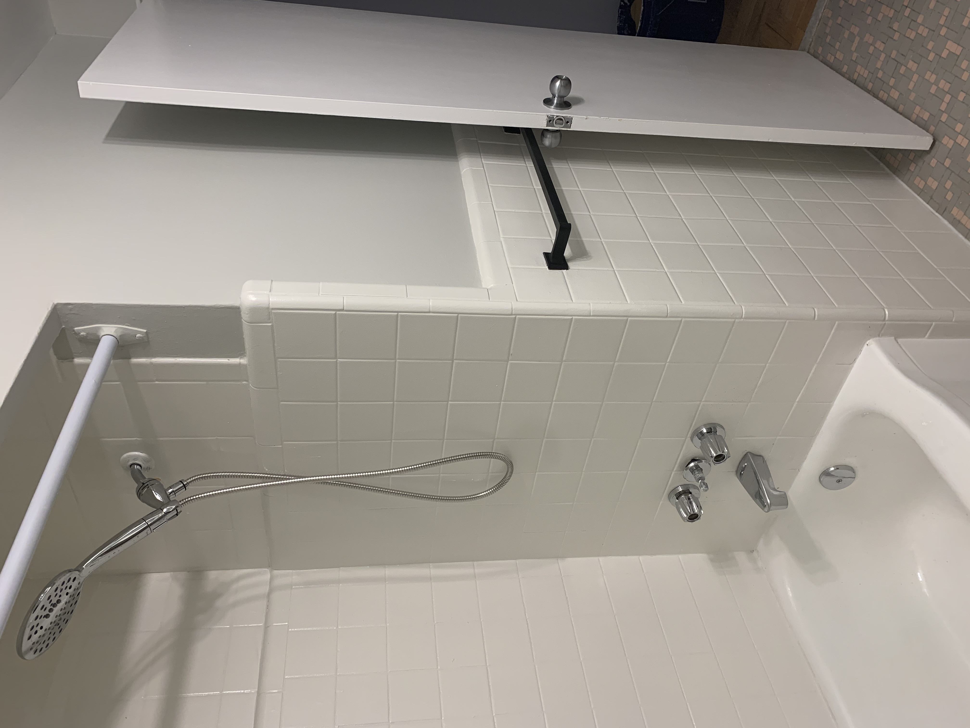 Vintage shower components were updated with a new shower head, drain stopper, showerhead, knobs, and escutcheon plates.