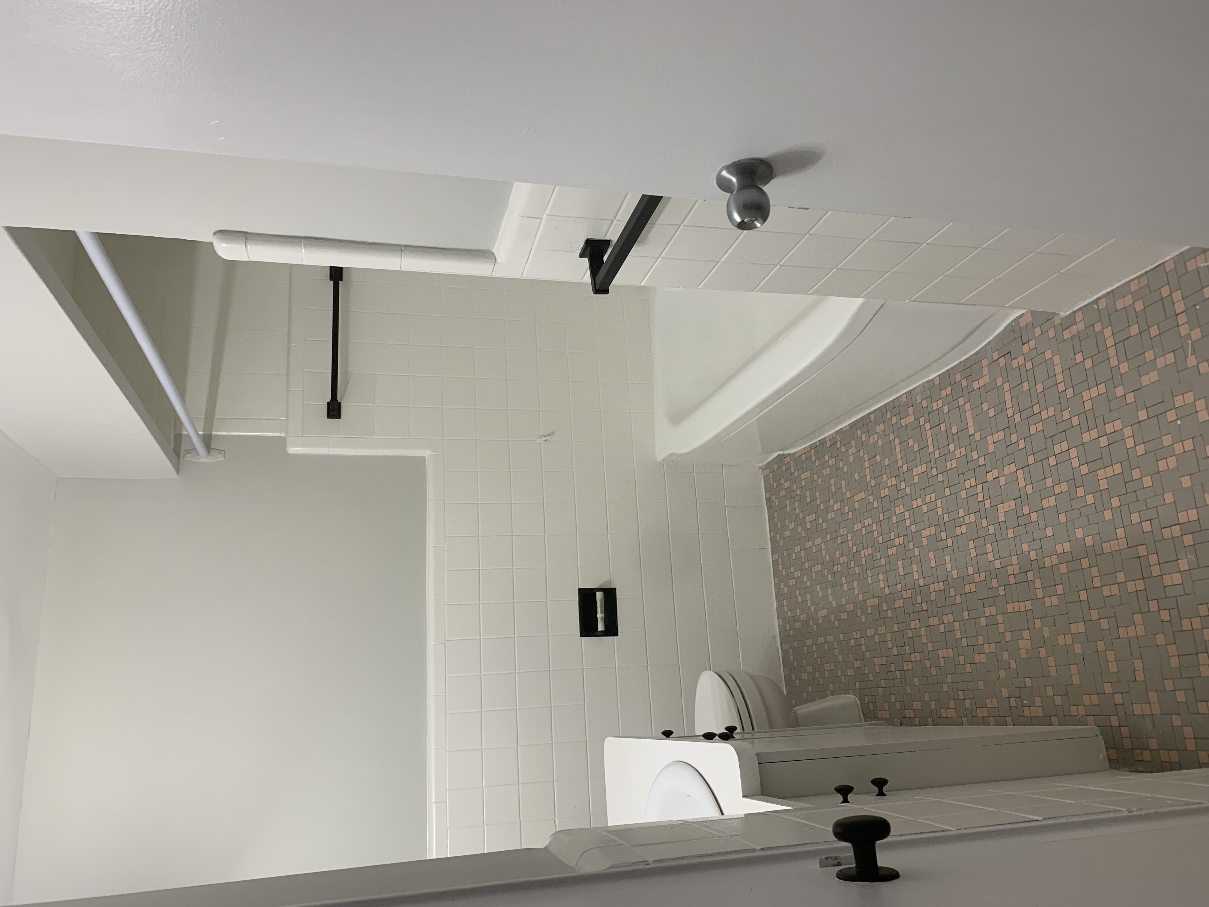 The existing accessories (towel bars, soap dishes, etc.) were given a matte black treatment to complete this monochromatic look.
