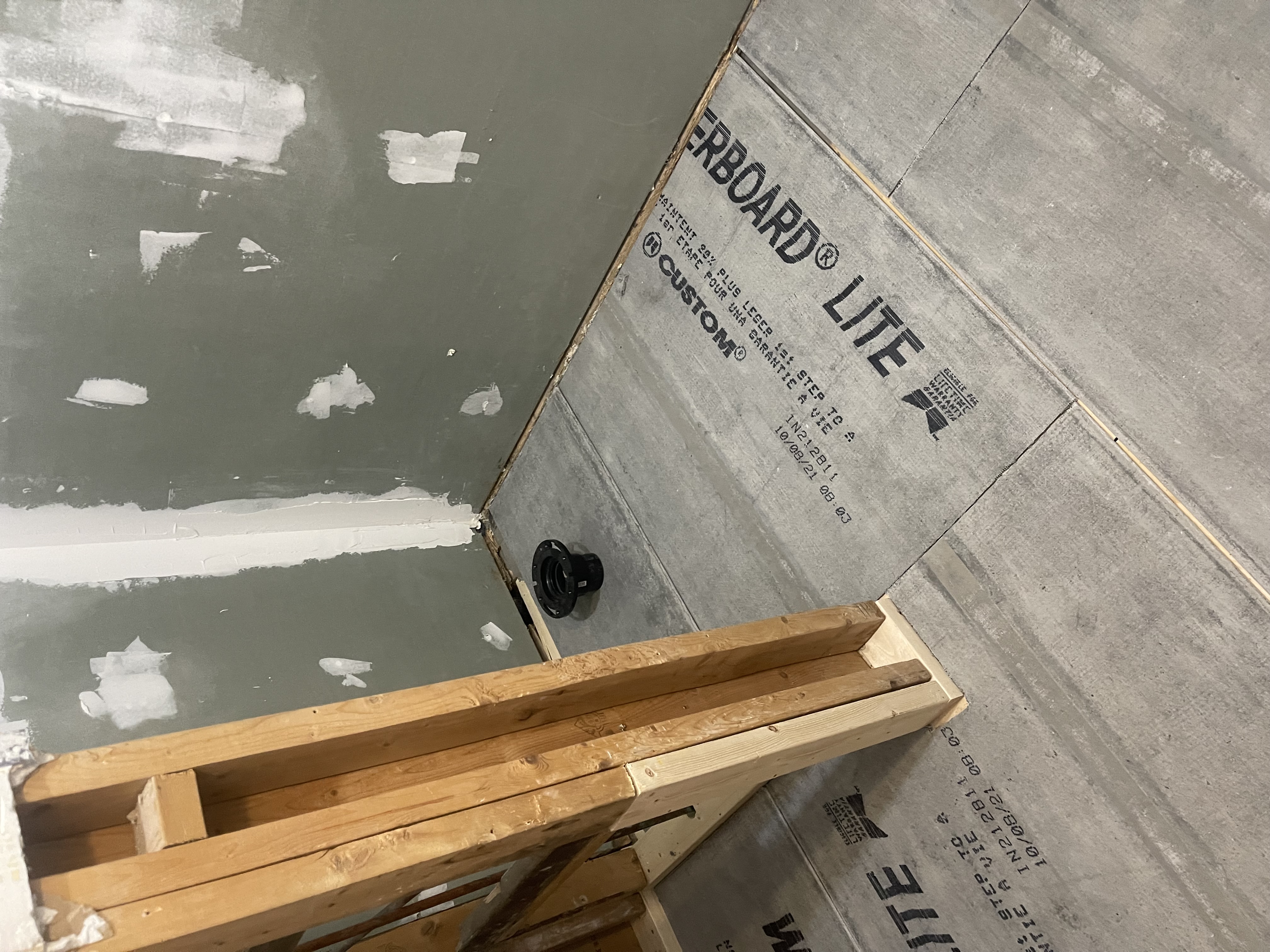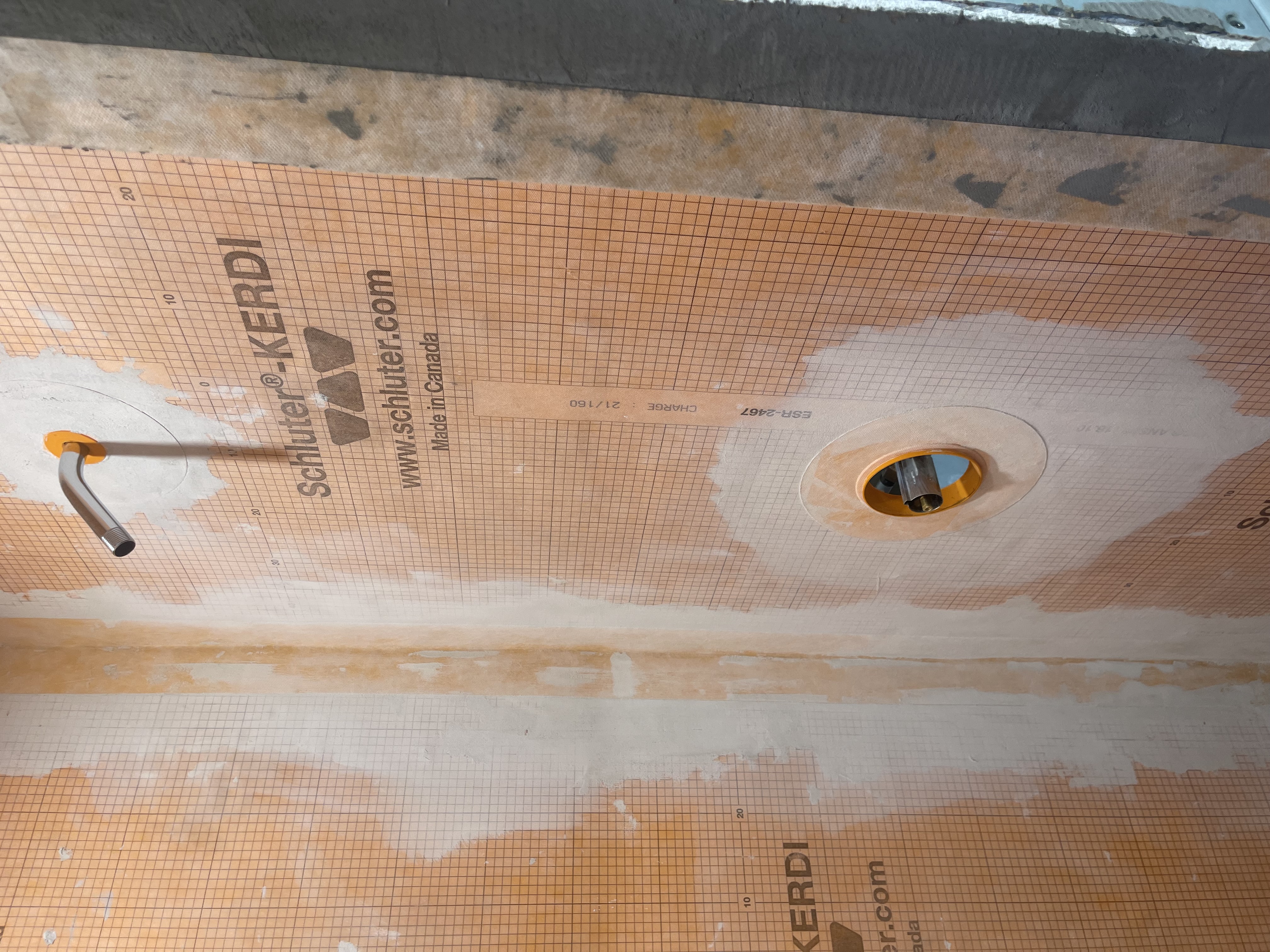 The Schluter waterproofing system provides watertight connections between the polystyrene shower pan, drain, shower curb and wall membrane.